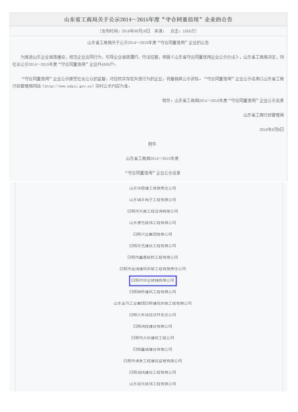 2016年8月8日,為推進(jìn)山東企業(yè)誠(chéng)信建設(shè),規(guī)范企業(yè)合同行為,引導(dǎo)企業(yè)誠(chéng)信履約、守法經(jīng)營(yíng),根據(jù)《山東省守合同重信用企業(yè)公示辦法》,山東省工商行政管理局向社會(huì)公示2014~2015年度“守合同重信用”企業(yè)共4505戶,日照市華業(yè)玻璃有限公司榜上有名。
