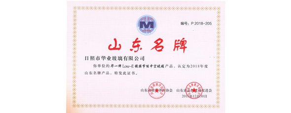 “華一”牌Low-E鍍膜節(jié)能中空玻璃產(chǎn)品,被認定為2018年度山東名牌產(chǎn)品。